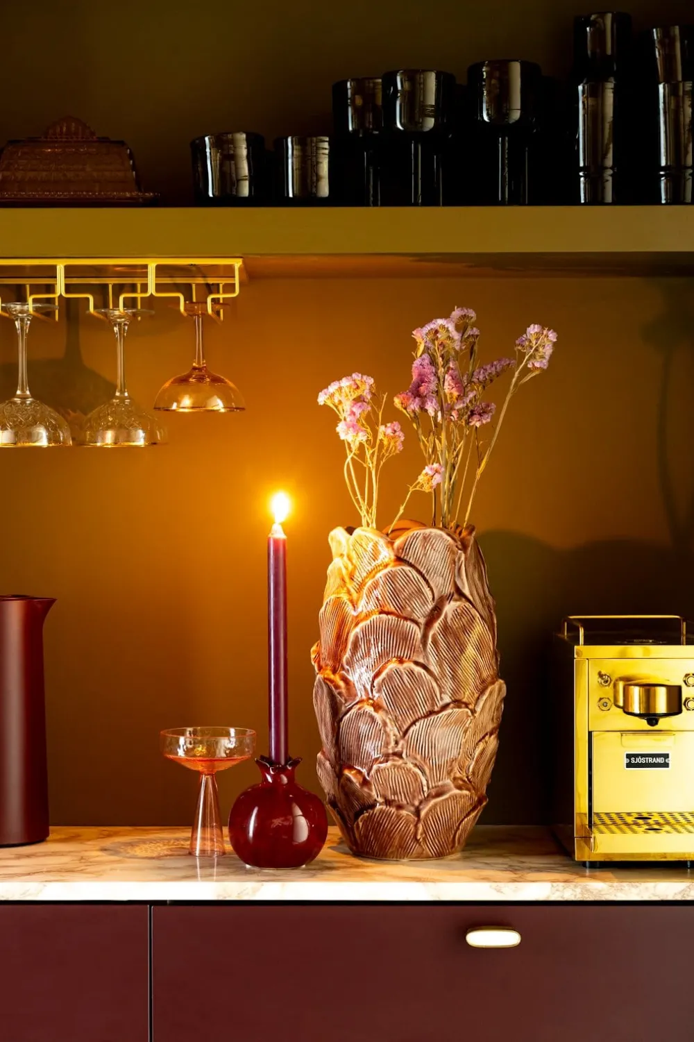 Le chandelier Pomegranate de COCOmaison est un magnifique accroche-regard avec un design ludique. Ce chandelier en céramique mesure 12 cm de haut et a la forme d’une grenade. La finition est en un riche émail bordeaux, qui dégage une impression de luxe. Ce chandelier ludique apporte une touche chaleureuse à chaque pièce et est parfait pour présenter vos bougies de manière amusante.