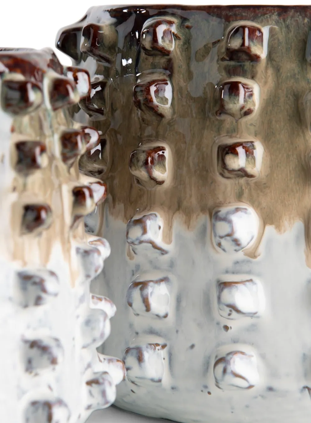 Rien de tel que le cache-pot SAAR pour apporter une touche spéciale dans votre maison. Fabriqué en céramique, ce cache-pot imperméable est émaillé de ‘piquants’ amusants à l’extérieur. Ce motif irrégulier et le dégradé de couleurs sur la couche de vernis confèrent un style artisanal au pot. Ce qui n’est pas si dénué de sens, car finalement, c’est la cuisson dans le four à céramique qui détermine l’apparence du pot. Chaque pot SAAR est donc réellement unique ! Celui-ci mesure 19 cm de haut, mais notre collection COCOmaison en propose un autre de 22 cm.