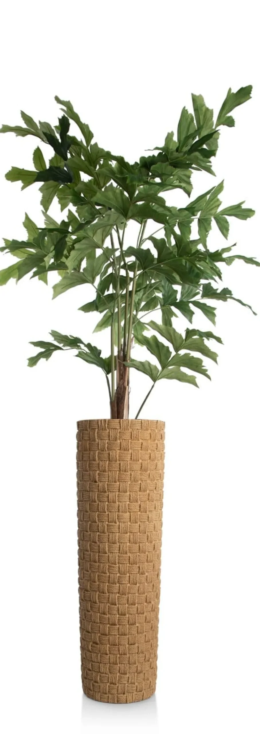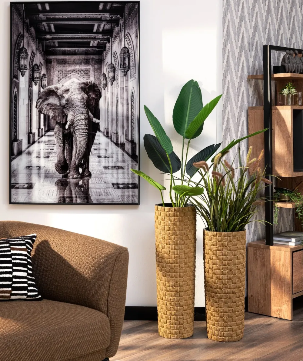 Vous avez la main verte, pourtant c’est la jungle chez vous ? Disposez votre plante préférée dans le pot NOUD et installez-la sur un piédestal. On dirait que ce cache-pot de COCOmaison est en lin tressé. En réalité, il est fabriqué en résine synthétique légère, mais solide et imperméable. Ce pot de 84 cm de haut et de 27 cm de diamètre propose une variante un peu plus petite. PS : si les plantes ne sont pas trop votre tasse de thé, disposez plutôt une grande plante artificielle ou quelques branches d’herbes de la pampa; effort minimum, effet maximum !